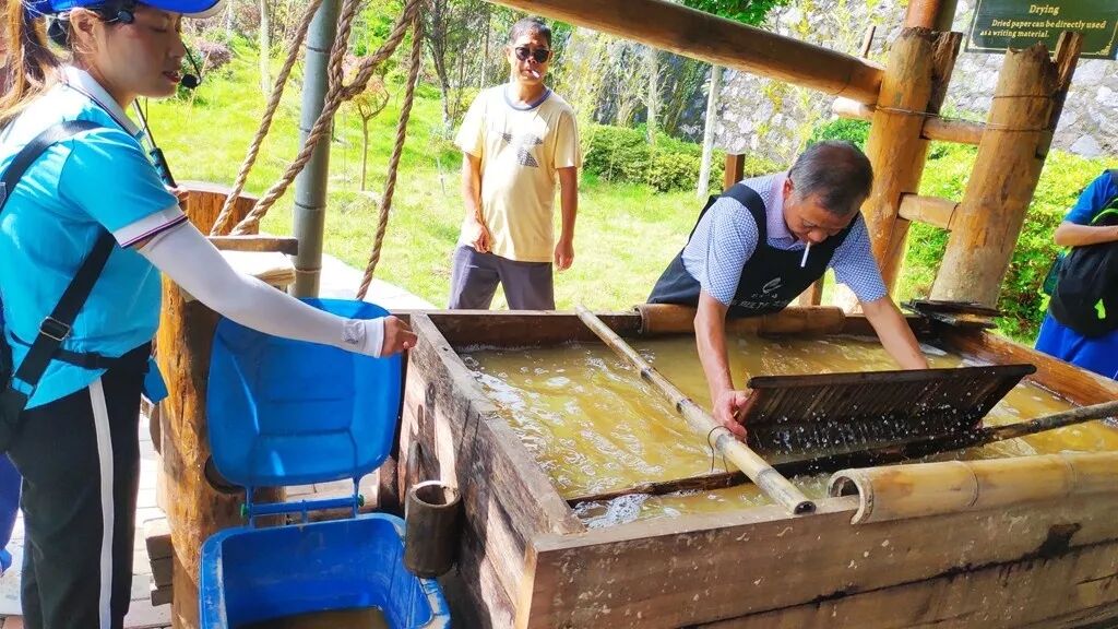 他们参观展览馆,了解农村发展历程及产业特色,学习农具变化的历史沿革,拓展土地流转、生态农业、休闲农业等农业知识。他们走进蓝鹰沙龙环保科普基地,了解沙龙村环境保护工程,学习造纸术,动手实践植物拓染。