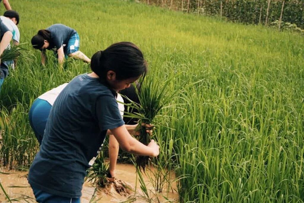 对于我们来说,扁担、锄头这些常见的农具不曾陌生,却也从来没有机会亲自体验。因此,如初次体验上学的孩童一般,当大家接到学农的第一个挑战——插秧的时候,无法平抚的幸福、跃跃欲试的新鲜感便向我们袭来。施肥并不是一件难事,但对于娇生惯养的我们来说,坚持显得尤为困难。刚开始靠着一股兴奋劲儿往前冲,二三个来回之后,便疲惫不堪了。肩上的扁担不知为何变得异常承重,烈日当空,挥汗如雨,也无暇顾及。回到宿舍以后,疲倦地如经过了一场激烈的战斗,全身酸痛。这时,我第一次明白了作为农民的艰辛。