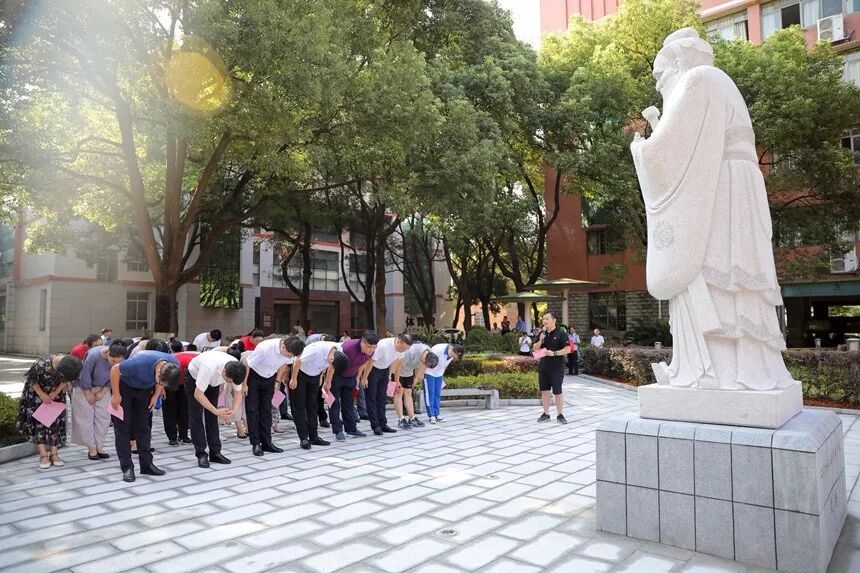 怀着崇敬的心情,校领导、师生及家长代表共同为孔子雕像揭幕,并向万世师表孔子行鞠躬礼。