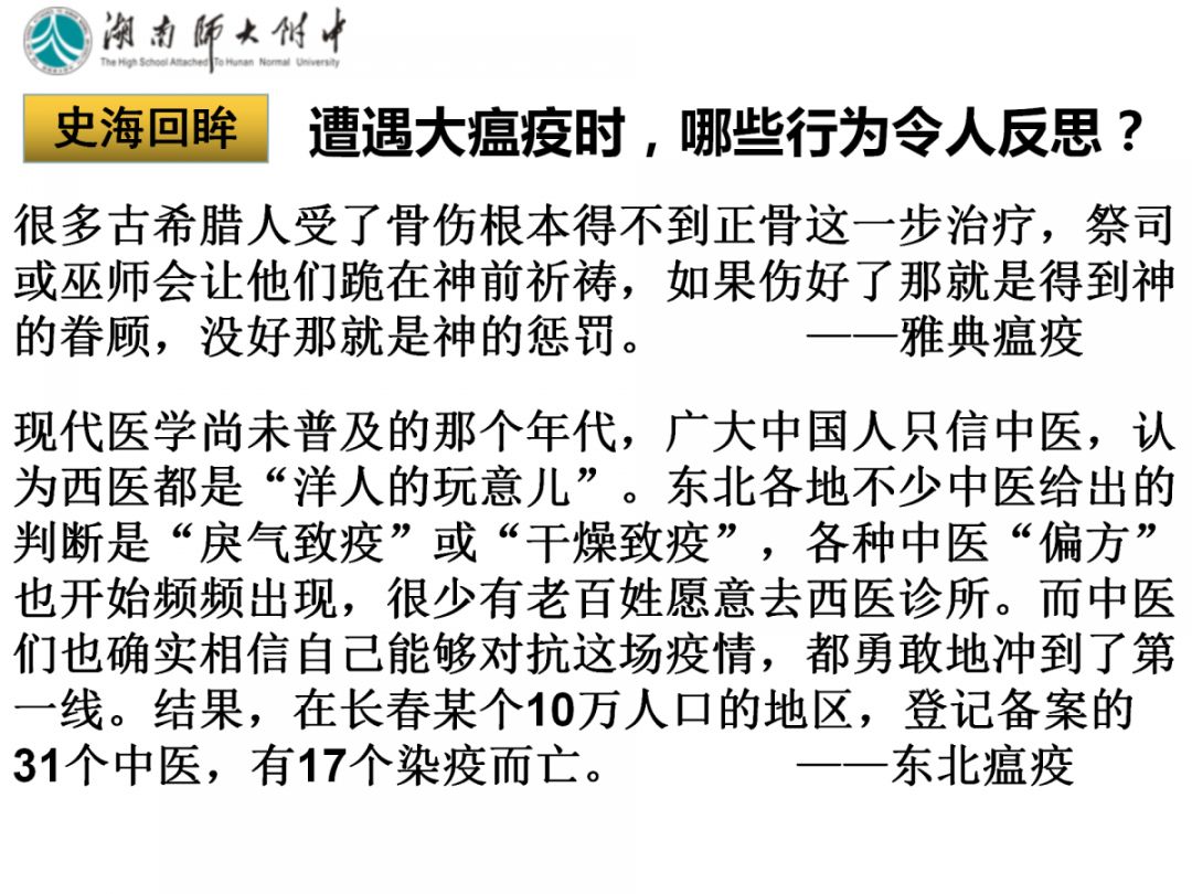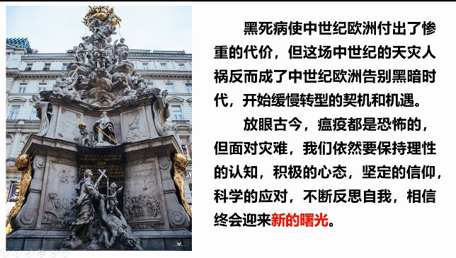 瘟疫为什么会大爆发?又为什么会平息?他们都对社会产生怎样的影响?人类每次从瘟疫中能获得怎样的进步?历史组的老师采用历史研究问题的方法,通过探寻历史上重大瘟疫的始末,分析瘟疫对社会发展的影响。