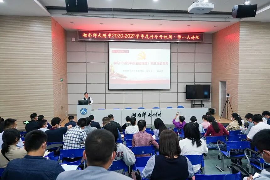 10月13日下午,对外开放周之惟一大讲坛在会议厅举行。学校党委书记、副校长黄月初精彩开讲,作了题为《学习<习近平谈治国理政>第三卷的思考》的专题报告,为2020-2021学年度开放周系列活动拉开帷幕,也正式启动了我校迎接建党100周年系列活动。因疫情防控要求,来自兄弟学校、附中集团校的200余名教师亲临会场参与活动,另有近4000人通过钉钉软件同时收看网络直播。活动由党委办公室副主任苏晓玲主持。