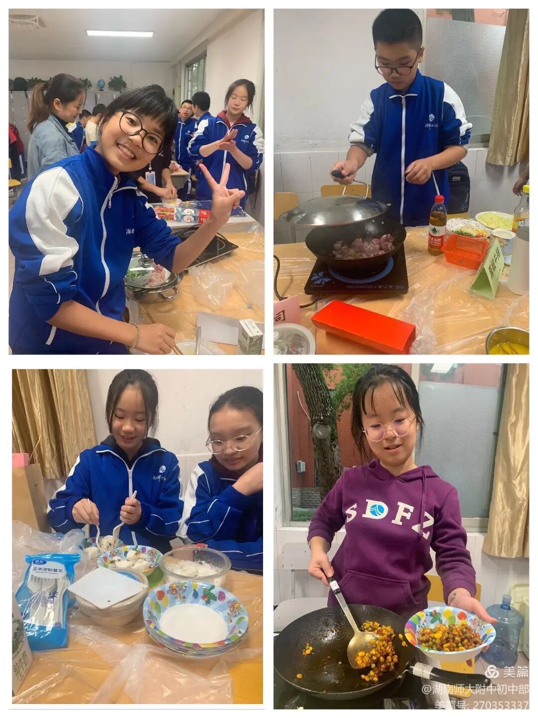 “锦绣人间一蔬菜水果大拼盘”“湘味湘韵一香干炒耳尖”“飞花点翠一西兰花炒虾仁”“青蛙王子一酸辣劲爆牛蛙”“甜蜜回忆一糖醋排骨”“凤凰涅槃一红椒炒鸡丁”“芬芳四季一蜂蜜百香果”“鸡兔同桌一鸡蛋小兔兔”“桃湖秋色一虫草菇排骨汤”“午后时光一日式和风小煎饼”......教室变美食工坊,稚气未脱的少年书生化身大厨,手掌勺瓢,烧烤烹炸煮溜,大秀厨艺。爸爸妈妈老师们开心品尝孩子们的作品,赞不绝口。