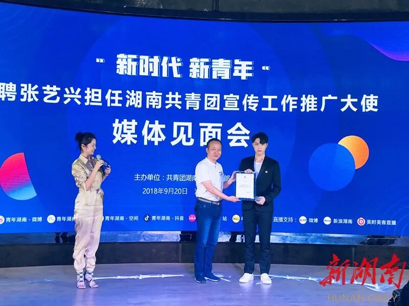 2019年,在“新时代 新青年”续聘张艺兴担任湖南共青团宣传工作大使媒体见面会上,团省委宣传部部长彭力为张艺兴颁发“湖南省共青团宣传工作大使”续聘聘书。彭力介绍,今年是张艺兴与湖南共青团携手的第三年,自2016年张艺兴担任湖南共青团宣传工作推广大使以来,与湖南共青团共同成长。三年来,严于律己、以身作则,坚持用努力、向上、向善的价值观影响年轻人。