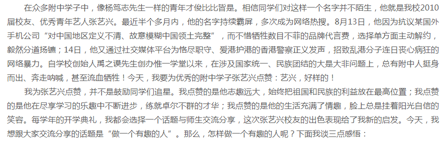 在湖南师大附中2019-2020学年度开学典礼上,谢校长为张艺兴的“志趣远大”点赞: