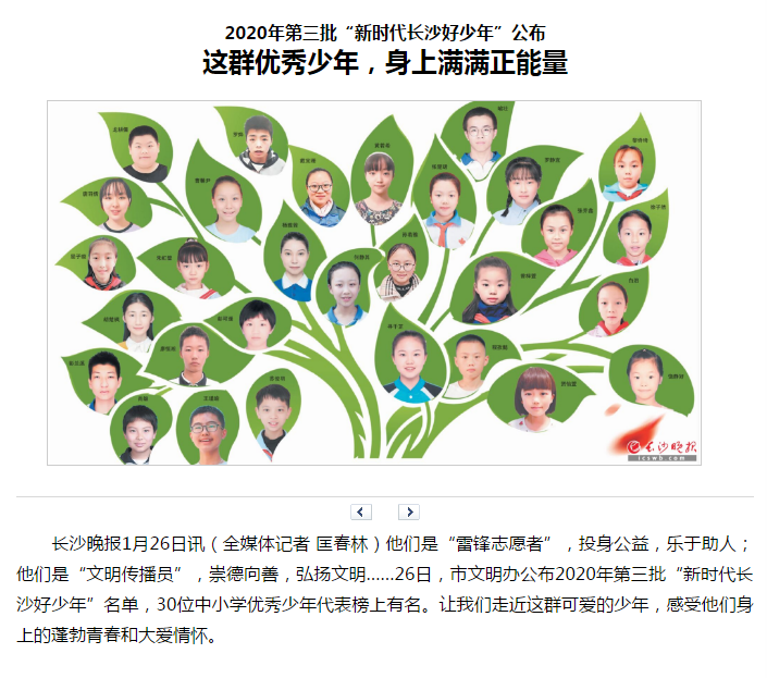 为深入贯彻落实党的十九大报告提出的“培养担当民族复兴大任的时代新人”要求,培育和践行社会主义核心价值观,帮助未成年人“扣好人生的第一粒扣子”,长沙市文明办组织开展了2020年第三批“新时代长沙好少年”学习宣传活动。经各地各部门严格把关、逐级推荐、认真筛选、考核评议,我校戴宜珊被评为2020年度第三批“新时代长沙好少年”。
