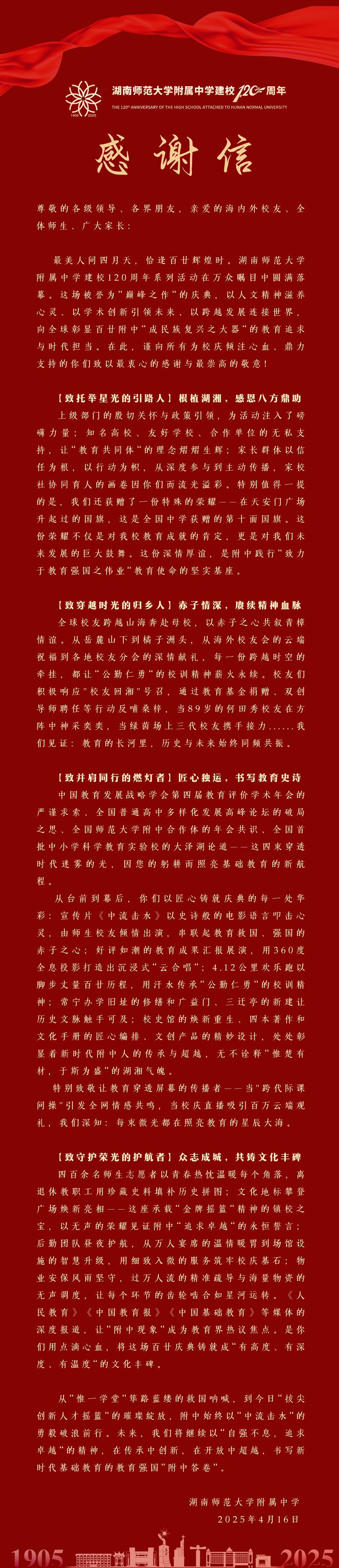 校庆专栏 校庆公告 校庆活动 庆贺集萃 联系我们 湖南师范大学附属中学120周年校庆公告(第四号) 发布:管理员 来源:未知 日期:2025-04-16 人气:分享到: 上一篇:“校友回湘”暨建校120周年高质量发展大会参会指南 下一篇:没有了 通知公告 更多 2026年多伦多大学士嘉堡校区绿色 2025年清明节放假通知 湖南师范大学附属中学2025年公开 湖南省教育厅关于做好湖南省教育 关于举办第二十二届学生社团节的 2025多伦多学士嘉堡校区夏校宣讲 最新动态 更多